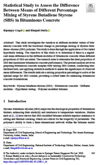- Statistical Study to Assess the Difference Between Means of Different Percentage Mixing of Styrene Butadiene Styrene (SBS) in Bituminous Concrete - https://link.springer.com/chapter/10.1007/978-981-95-2588-1_14